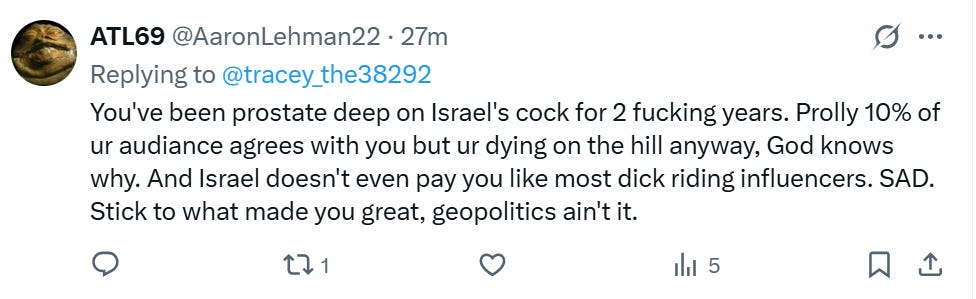 I am paid by my audience, who I try to entertain. Period, end of story. My audience, at least the vocal ones, are livid at me and hate my position on Israel. So…………..how is this me holding a stance to GAIN money, when in reality, it’s me holding a stance DESPITE LOSING MONEY, because I care about the topic and about my own personal integrity.