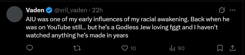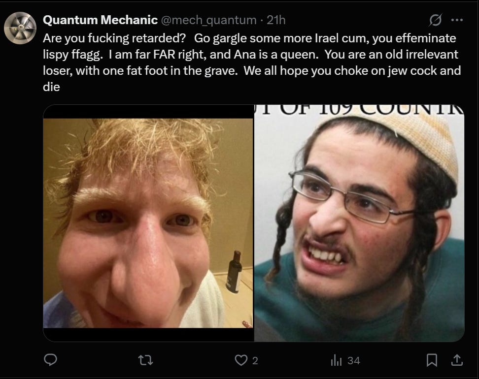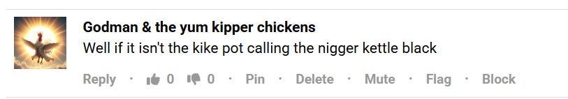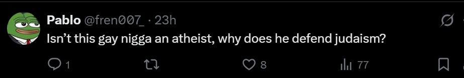 This one is too wild for me to even wrap my brain around. I see that he got a kike and nigger off, but why? I’ll just back away slowly into the bush like Homer Simpson on this.