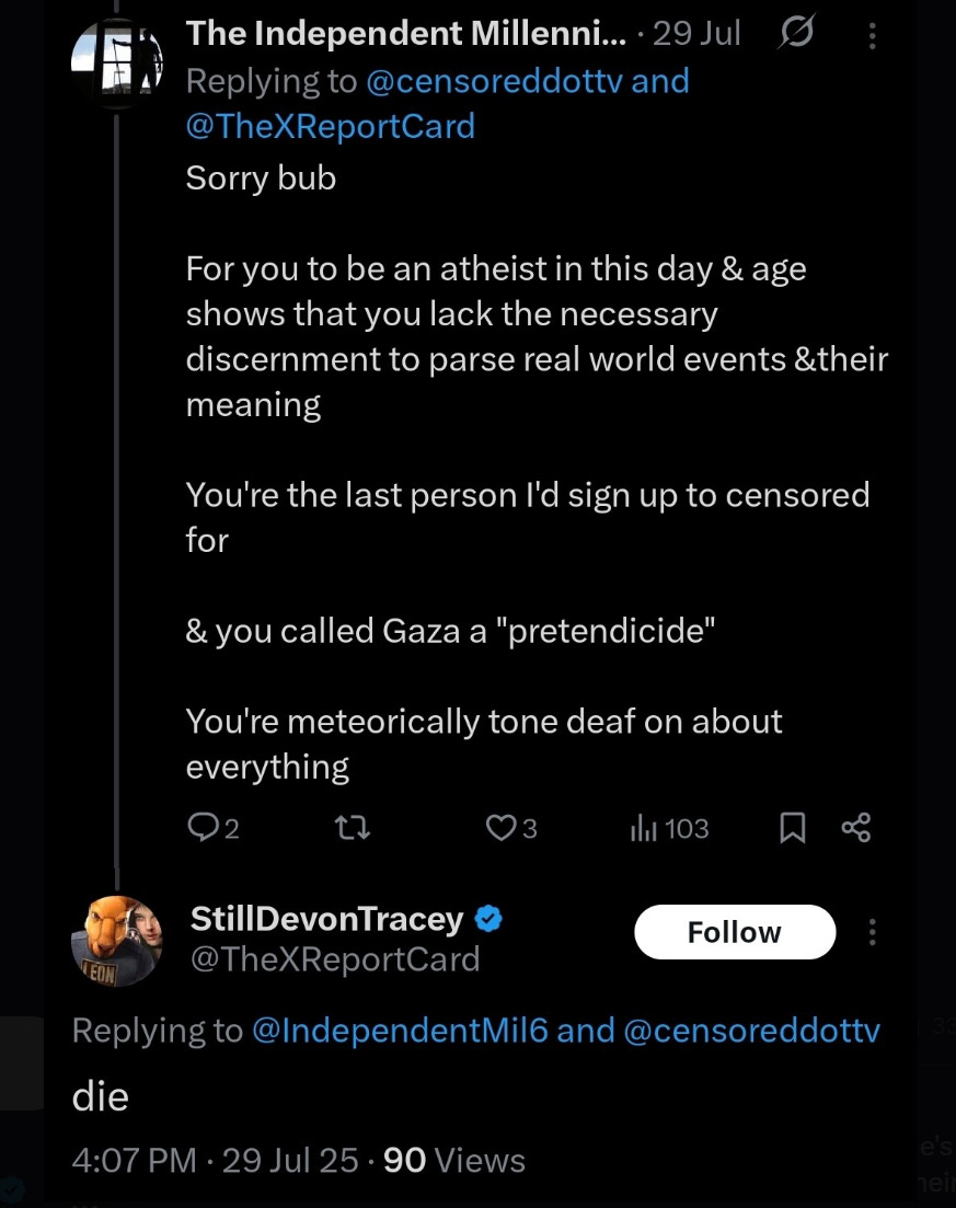 lol. Classic Devon from a few days ago. I see you bro. Let me third person this paragraph. Devon’s atheism seems to be randomly triggering this piece of shit. I like how he thinks atheism in ‘today’s day and age’…….like what? What are you talking about? Dork, there is no god. There never was. Hello? Move on. Holy shit.