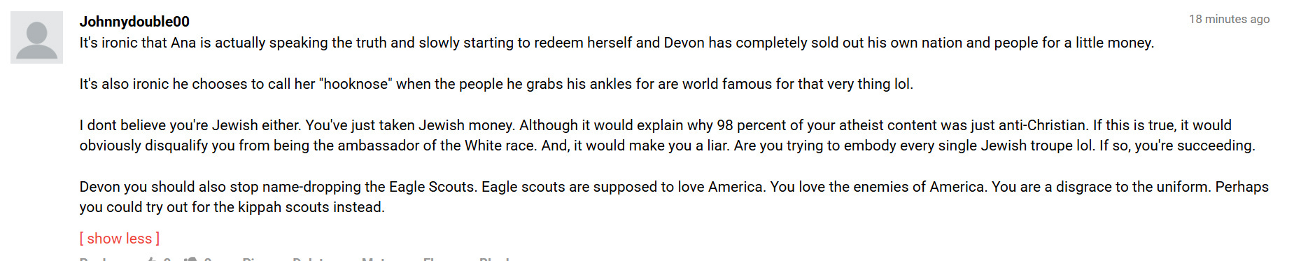 Atheism is Unstoppable is godless? You don’t say. And yet you watched….hmmm, interesting. And again I am accused of Jew loving and of being a faggot. Funny, how after Charlie Hebdo, I wasn’t accused of being French loving. Or after me condemning any act of Islamic terror in America, no one said, there goes that American loving faggot, Devon. It’s only when it comes to Israel that this insanity pops off.